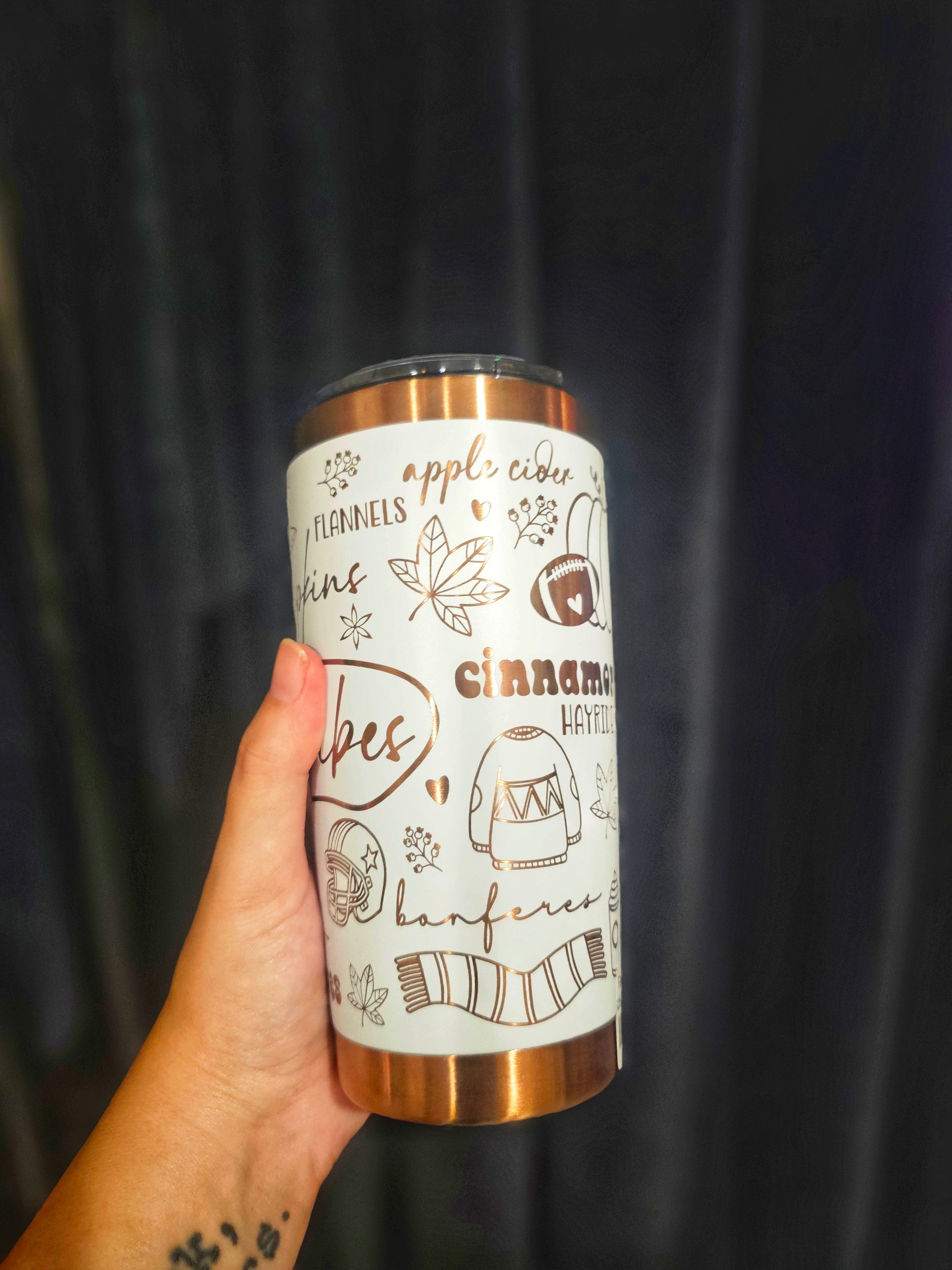 Introducing the Fall Vibes 20 oz stainless steel tumbler, perfect for keeping your drinks at just the right temperature! With its gorgeous cream and copper design, this tumbler will add some fall vibes to your day. Double walled for insulation, it's the perfect autumn accessory. Cheers!