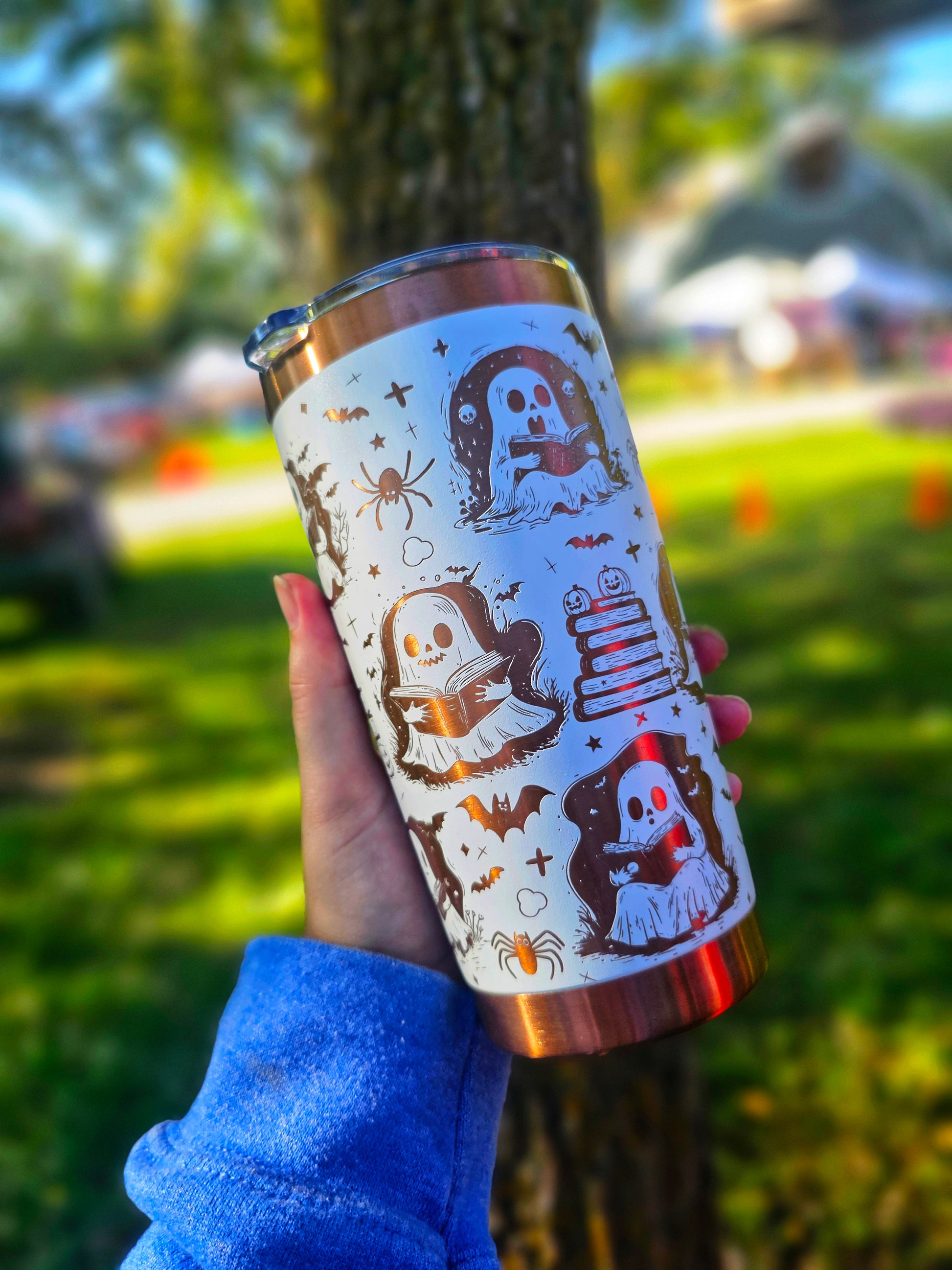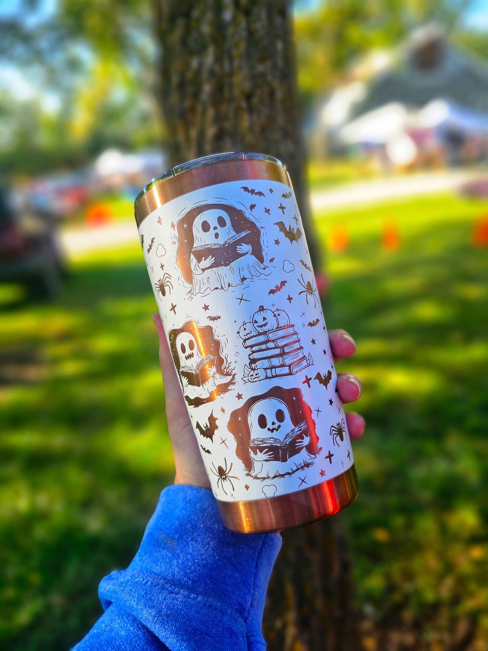 Introducing Reading Ghosts, the 20 oz double walled stainless steel mug perfect for book lovers. Made in house, it's a spooktacular way to keep your tea or coffee warm while getting lost in your favorite story.